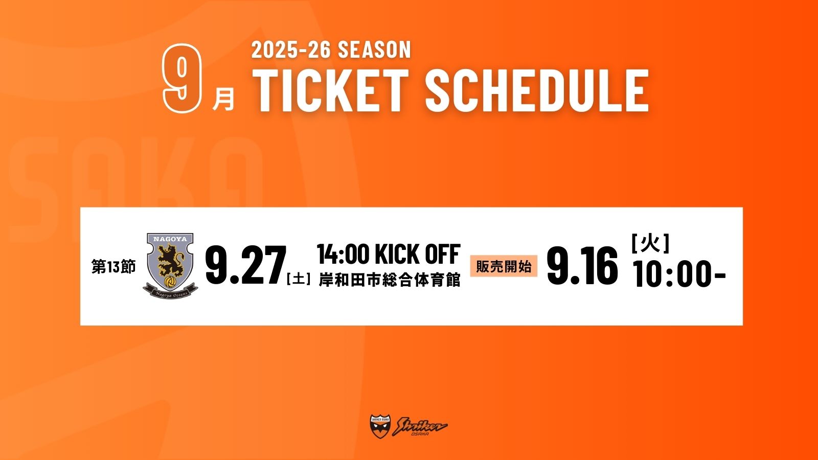 9月に開催するシュライカー大阪ホームゲームのチケット販売開始日時についてお知らせいたします。