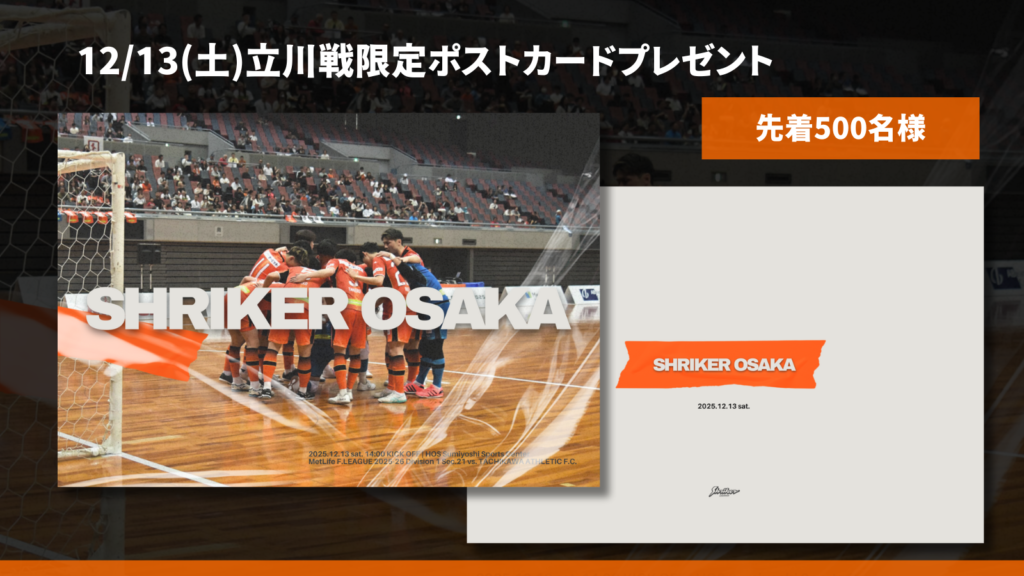 12月13日(土)HOS住吉スポーツセンターにて開催致します「メットライフ生命Fリーグ 2025-26 ディビジョン1 第21節 シュライカー大阪 vs 立川アスレティックFC」のホームゲーム情報をお知らせ致します。