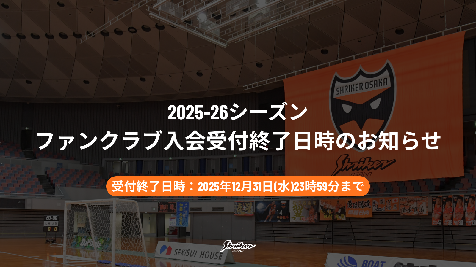 シュライカー大阪では、下記日程をもちまして、2025-2026シーズン「オフィシャルファンクラブ会員」の新規入会受付を終了することとなりましたので、お知らせいたします。