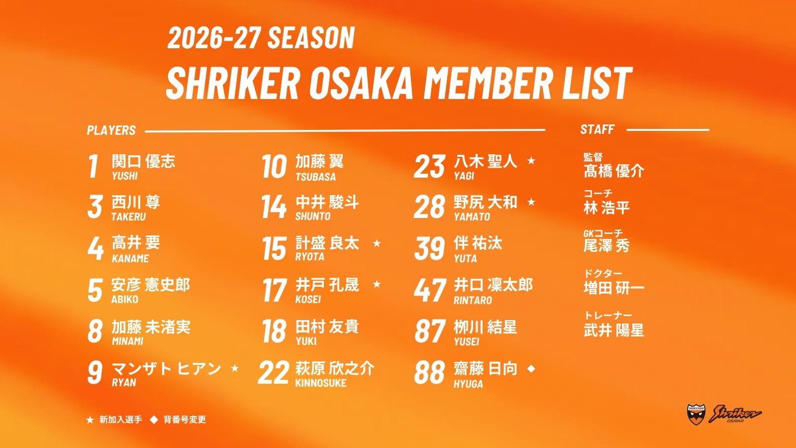 この度、2026-27シーズンのシュライカー大阪トップチーム体制および選手背番号が決定しましたのでお知らせいたします。