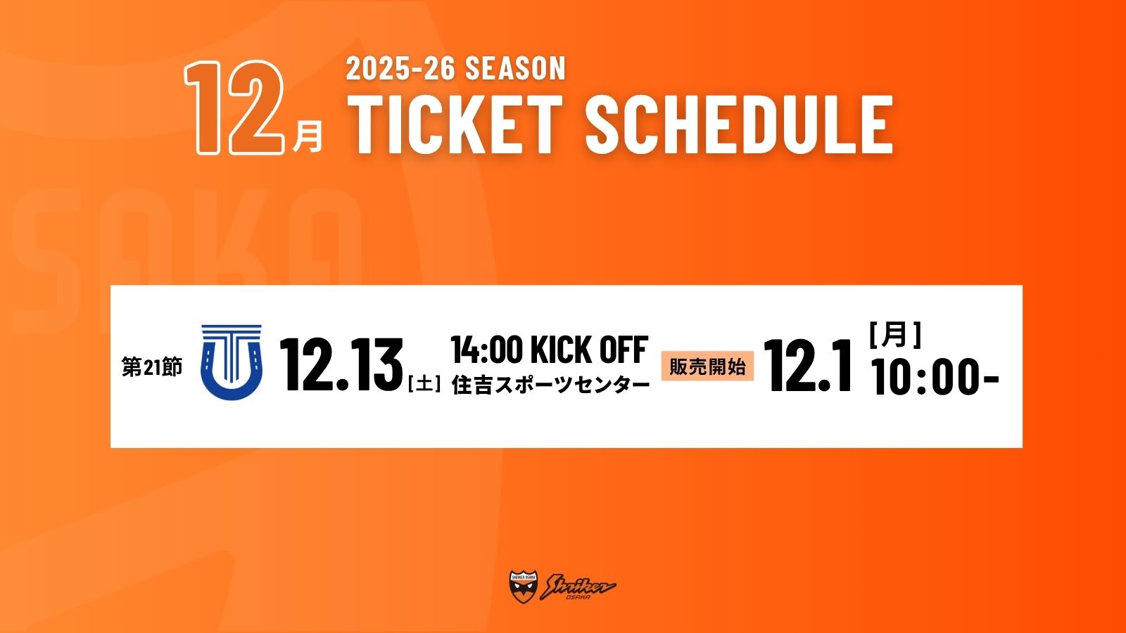 12月に開催するシュライカー大阪ホームゲームのチケット販売開始日時についてお知らせいたします。